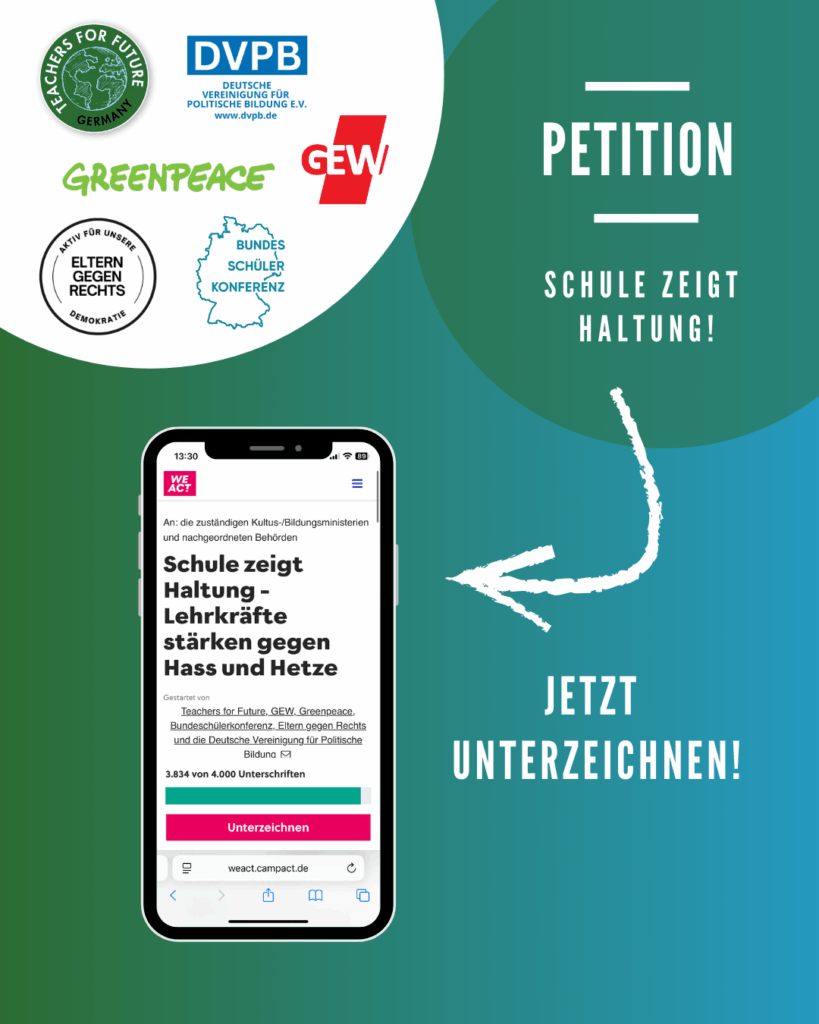 💪 In einem großen Bündnis mit Greenpeace, GEW, u.a. starten wir die Kampagne „Schule zeigt Haltung“ mit einer starken Petition. In nur 24 Stunden haben bereits über 4000 Menschen unterschrieben!